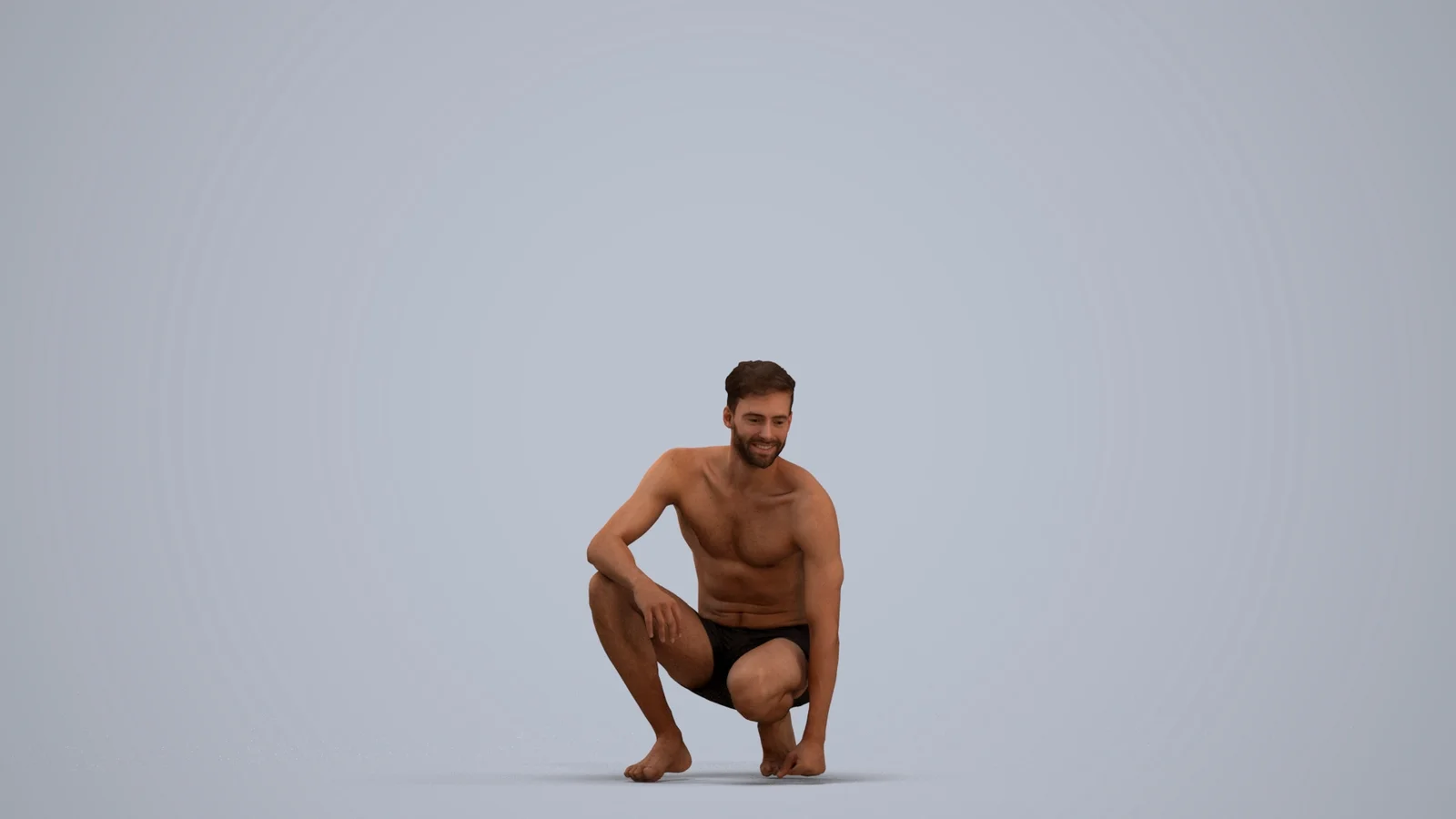 A 3D model of an adult Caucasian man crouching in casual summer swimwear. The asset consists of approximately 40,000 triangles and 20,000 vertices, and includes a 2K resolution JPG color texture. It is available in several standard 3D formats for broad compatibility, including FBX, OBJ, and GLB.