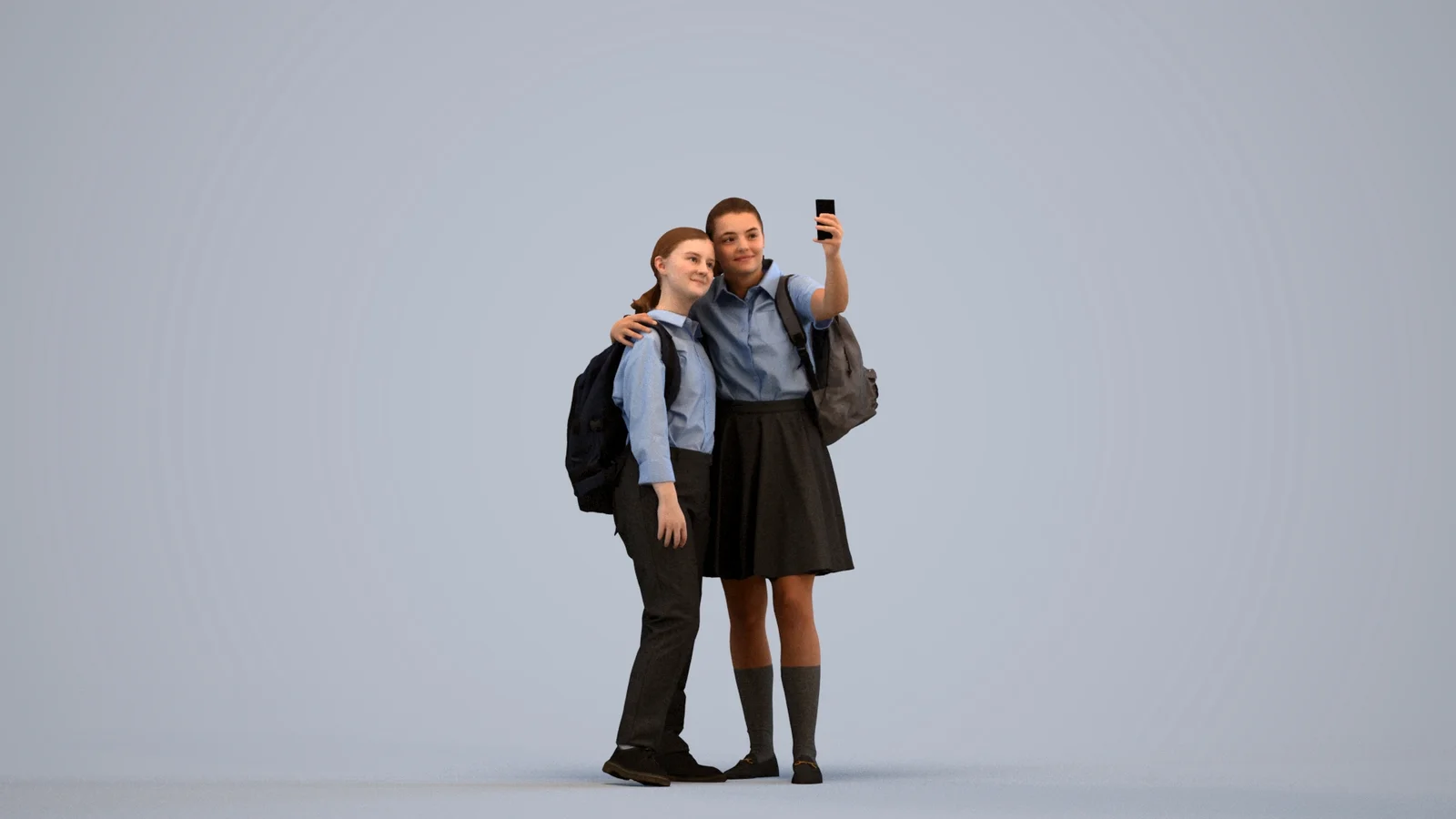 A 3D character model featuring two girls in school uniforms captured in a selfie-taking pose. The asset includes approximately 40,000 triangles and 20,000 vertices per character. It comes equipped with a 2K resolution JPG color texture map for surface detailing.
