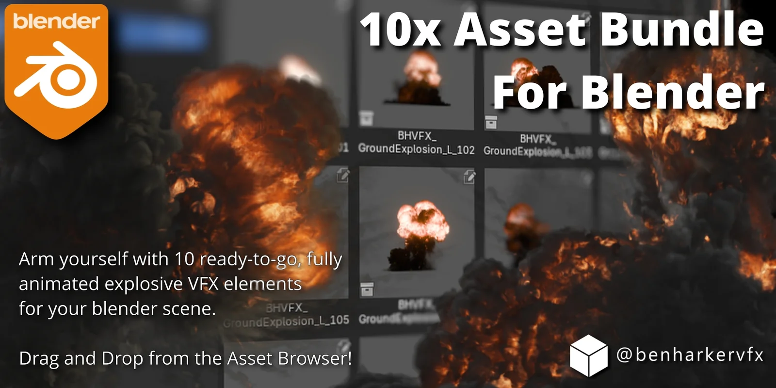 This collection includes 10 pre-rendered ground explosion visual effects optimized for Blender's Asset Browser. The assets are packaged to be dragged and dropped directly into 3D environments, providing quick explosion sequences without the hardware cost of running local simulations. The effects are fully compatible with both the EEVEE and Cycles render engines.