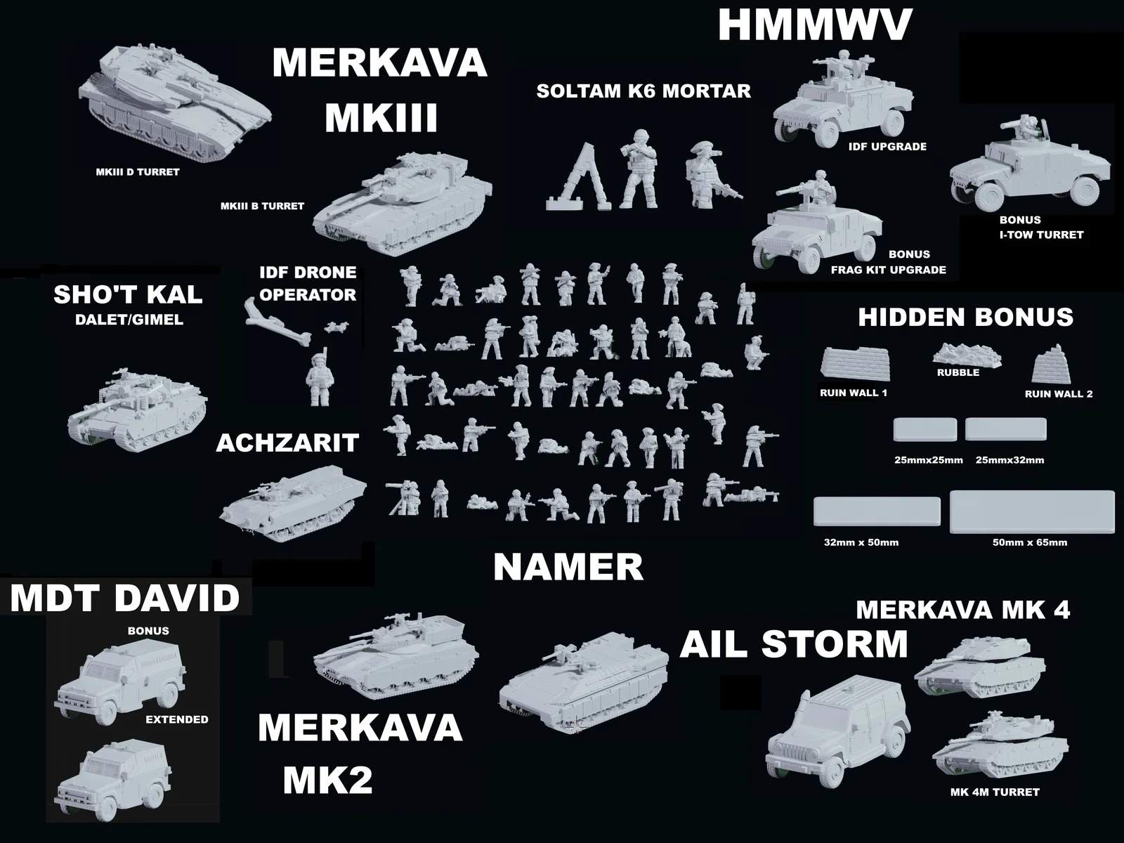 This is a comprehensive collection of 3D printable models representing near-modern Israeli military forces. Scaled at 1/100 (approximately 15mm tabletop scale), the bundle includes both infantry units and various ground vehicles. The vehicle roster features the Merkava MK II, MK III, and MK IV tanks, alongside the Sho't Kal, Achzarit APC, Namer APC, MDT David, AIL Storm, and Israeli variants of the HMMWV.