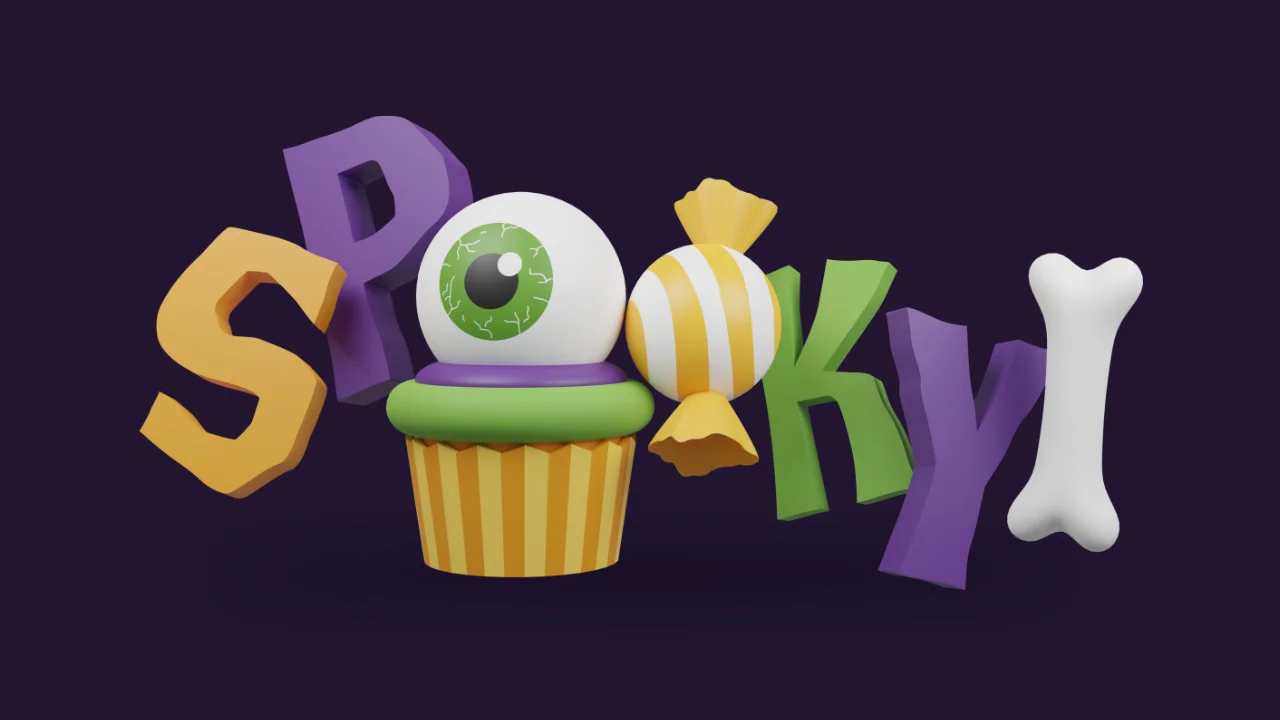 A collection of twelve 3D models featuring Halloween-themed sweets and cupcakes. The assets are designed in a 3D icon style. The full package includes the original Blender source file alongside rendered PNG images with transparent backgrounds for each item.
