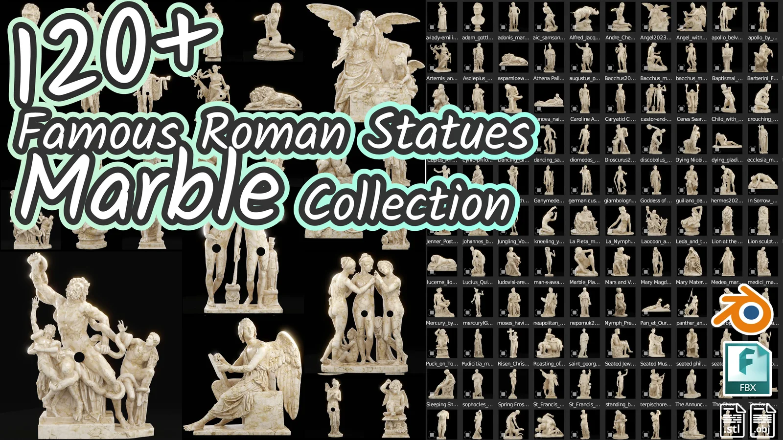 This collection contains over 120 3D models of famous Roman statues. Each asset is provided with a marble PBR material setup and UV unwrapped 4K textures, which are packed directly into the main blend file. The models are decimated to range between 10,000 and 50,000 vertices, balancing recognizable detail with viewport performance for set dressing.