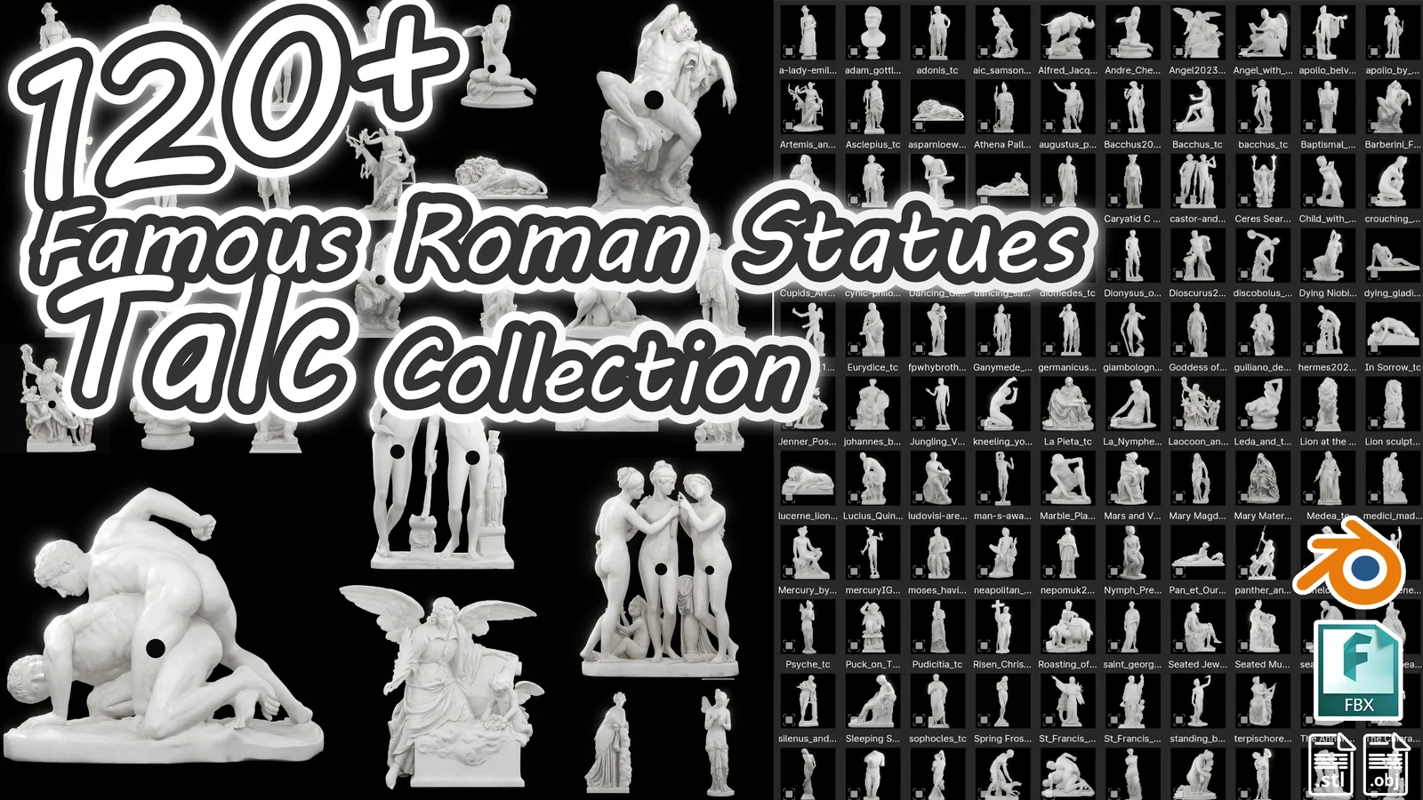 This collection provides over 120 3D models of famous Roman statues, featuring a talc material finish. The models are decimated, ranging from 10,000 to 50,000 vertices, and come fully UV unwrapped. Each statue includes 4K PBR textures that are packed directly into the provided .blend files.