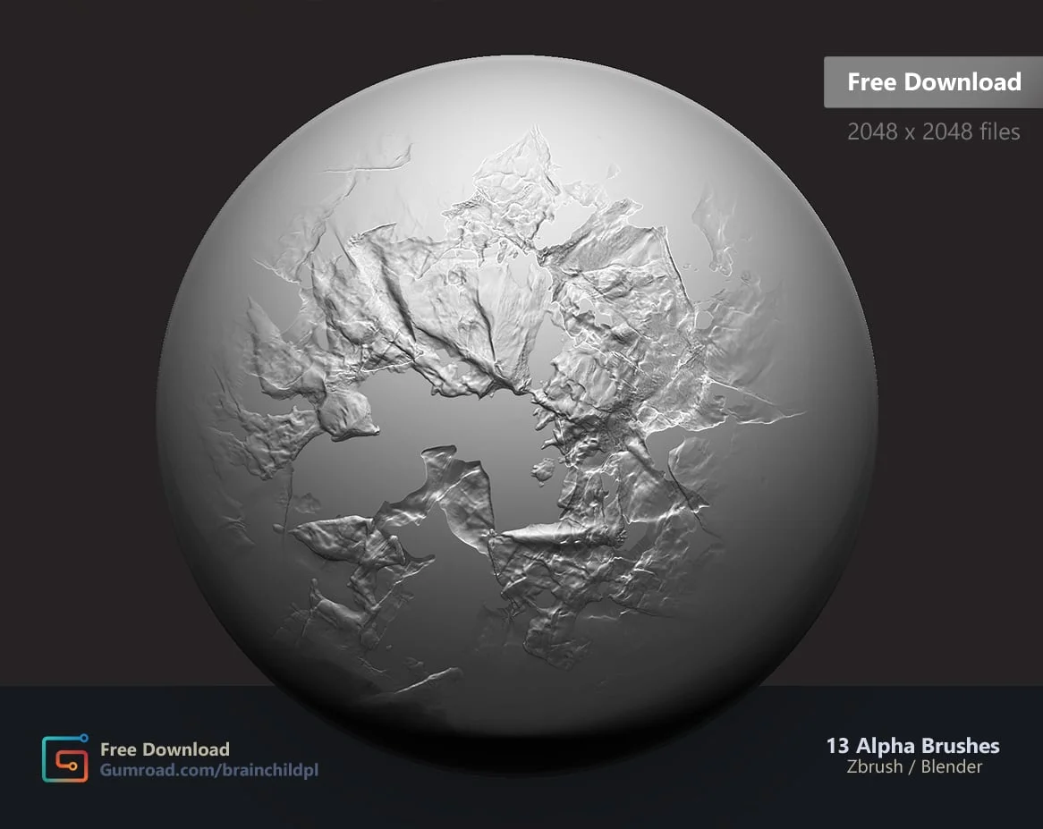 A collection of 13 tileable alpha brushes for 3D sculpting and texturing workflows. These alphas are designed for adding surface details such as rock formations, cracks, monster skin, and wood grain. Each alpha map is provided at a resolution of 2048x2048.