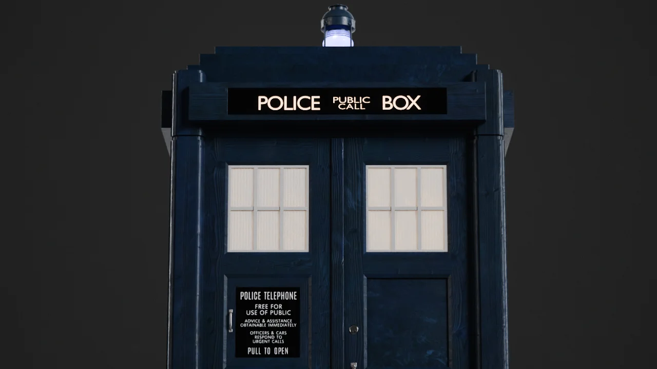 A 3D model based on the 15th Doctor's Tardis, designed for use in Blender. The model is unrigged and features a parented base to facilitate movement, making it suitable for space or vortex animation sequences. It is optimized exclusively for the Cycles render engine due to specific glass shader interactions with light transmission.