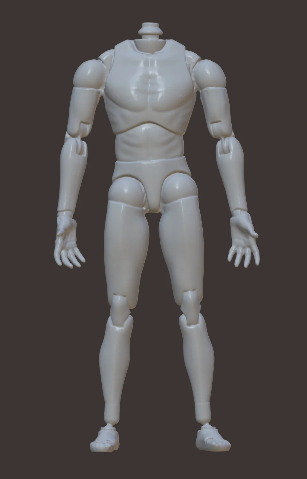 This is a 3D scan of a 1/6 scale TTM-18 styling buck body, provided in the STL file format. It serves as a dimensional reference model for sizing and fitting custom head sculpts. The model can also be used as a scale base when modeling custom armored parts and accessories to ensure accurate fitment prior to 3D printing or final rendering.