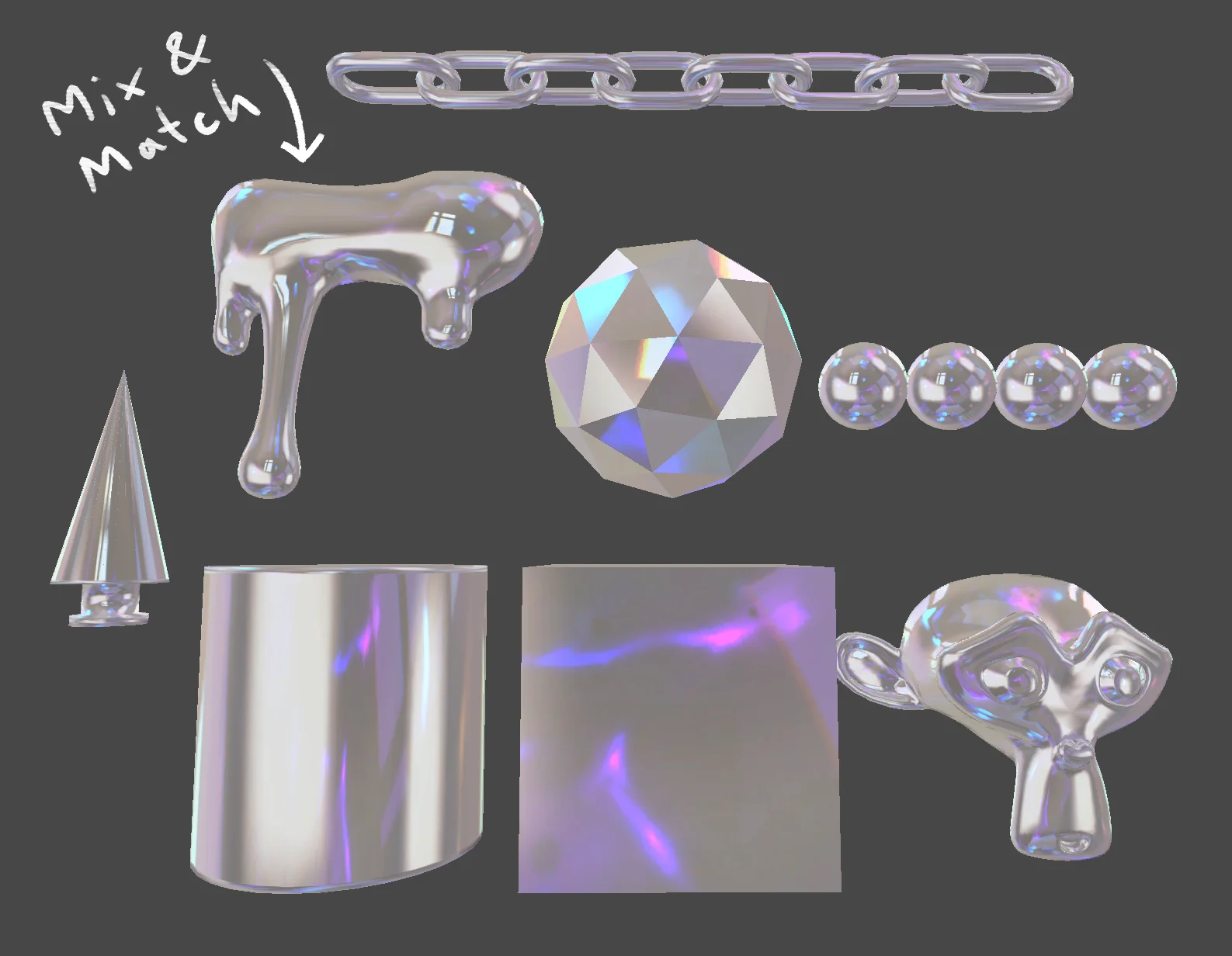 A collection of 95 hand-drawn matcap textures provided in 1024x1024 PNG format. The pack includes distinct surface styles such as silk, gem, glass, iridescent, pearl, rubber, and metal. These image maps can be applied to geometry for quick viewport shading, layered, tinted, or combined with emission values to create varied stylized material effects for 3D characters, props, and environments.