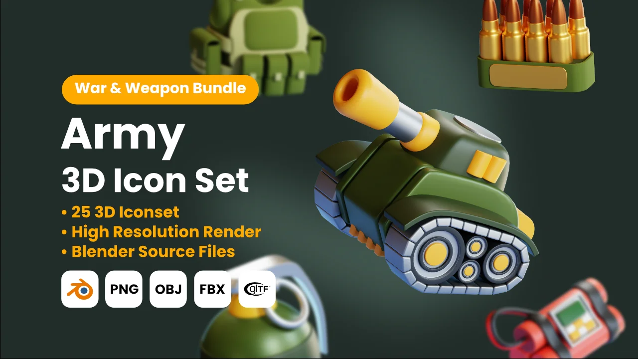 This collection provides 25 military and army-themed 3D icons designed for user interfaces and graphic design. The assets are supplied as native Blender files, allowing users to modify materials, lighting, and camera angles to suit specific project needs.