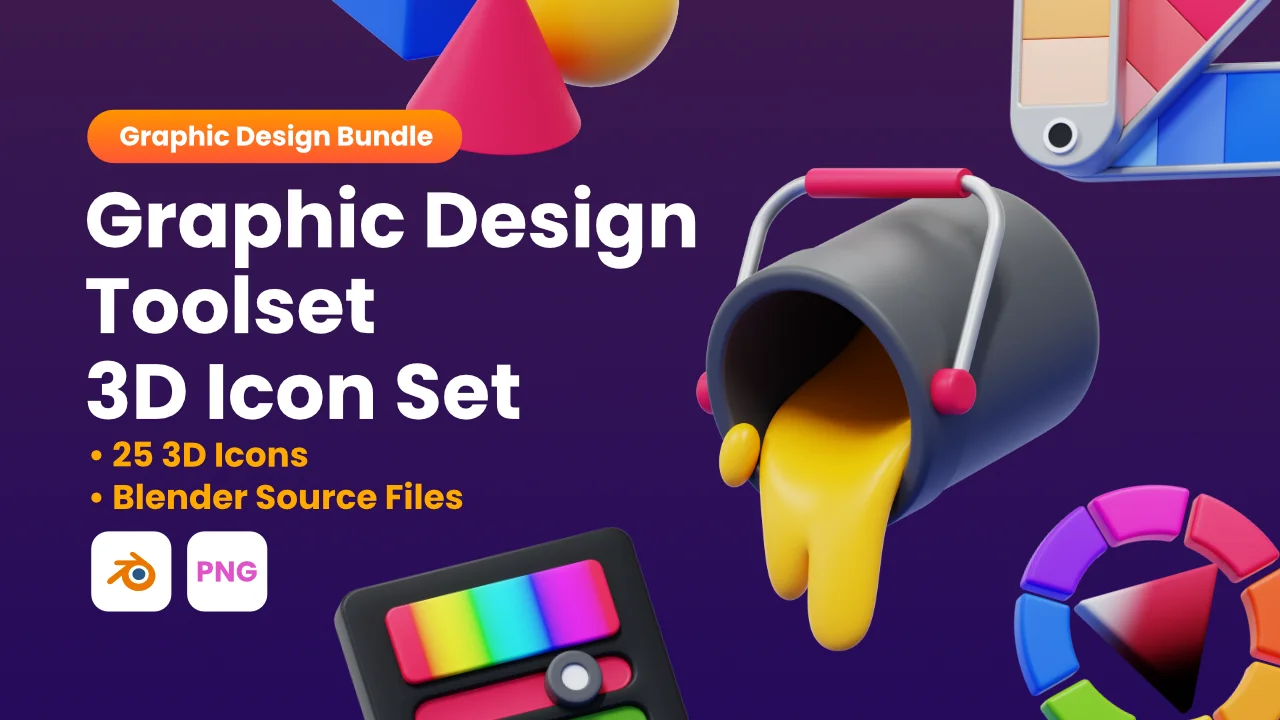 This collection features 25 3D models themed around graphic design tools. The package includes a native Blender file containing the 3D geometry, allowing for custom adjustments and rendering. It also provides pre-rendered PNG files of each icon at a resolution of 3000 by 3000 pixels.