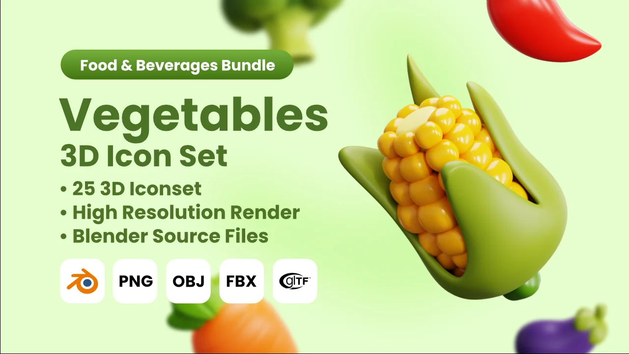 A collection of 25 3D vegetable models designed for use as icons. The pack provides the original Blender source files, allowing for custom material edits, lighting adjustments, and varied rendering angles. Additionally, it includes pre-rendered high-resolution PNG image files at 3000 by 3000 pixels for immediate integration into UI designs, web projects, or graphic illustrations.