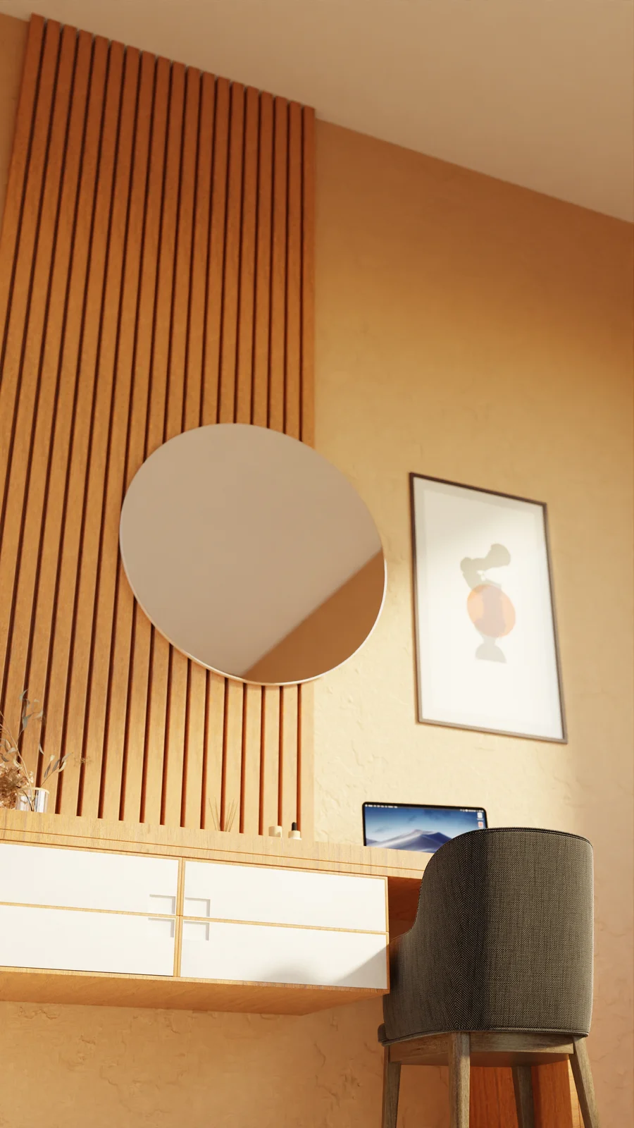 This is a 3D model of a wooden dressing table designed to convert into a workstation. The model features a wooden table section that rotates 90 degrees to function as a desk, along with a top portion that unfolds to provide additional workspace. The unit also includes four drawers for storage, representing a space-saving furniture concept suitable for interior scenes or woodworking reference.