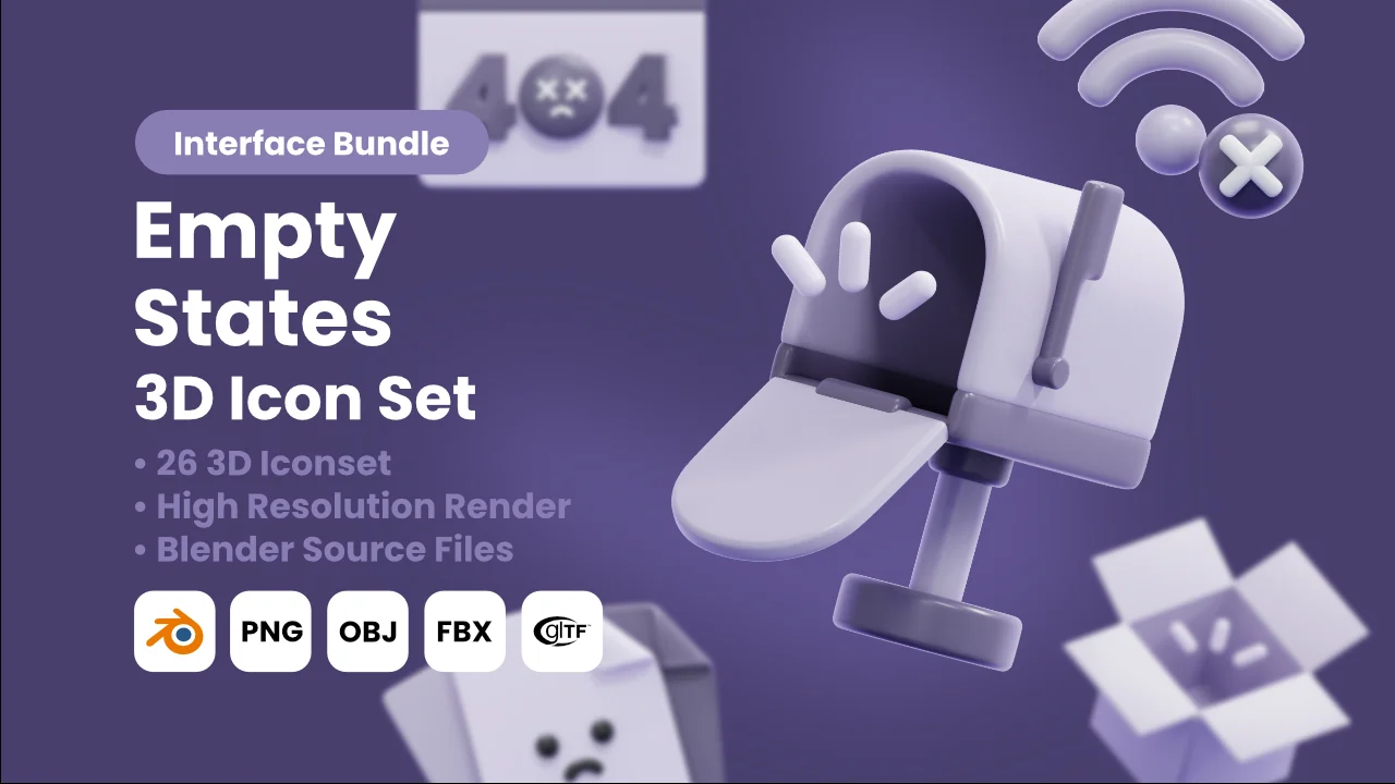 A collection of 26 3D icon models designed for use in user interface empty states. The collection includes the original Blender source files for further customization, along with pre-rendered PNG images at 3000 by 3000 pixel resolution.