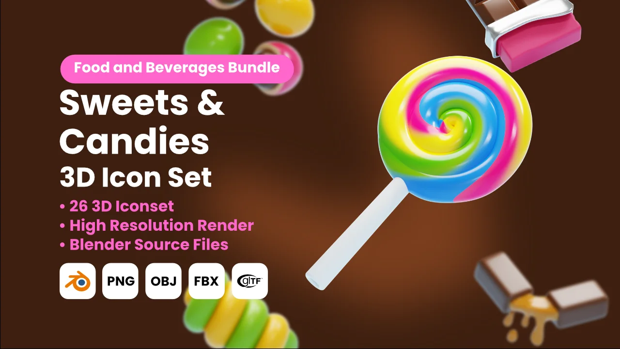 This asset pack contains a collection of 3D models featuring various sweets and candies designed for use as icons. The assets are provided as native Blender files, allowing users to modify the geometry, adjust materials, or change the lighting setups to suit their specific project needs.