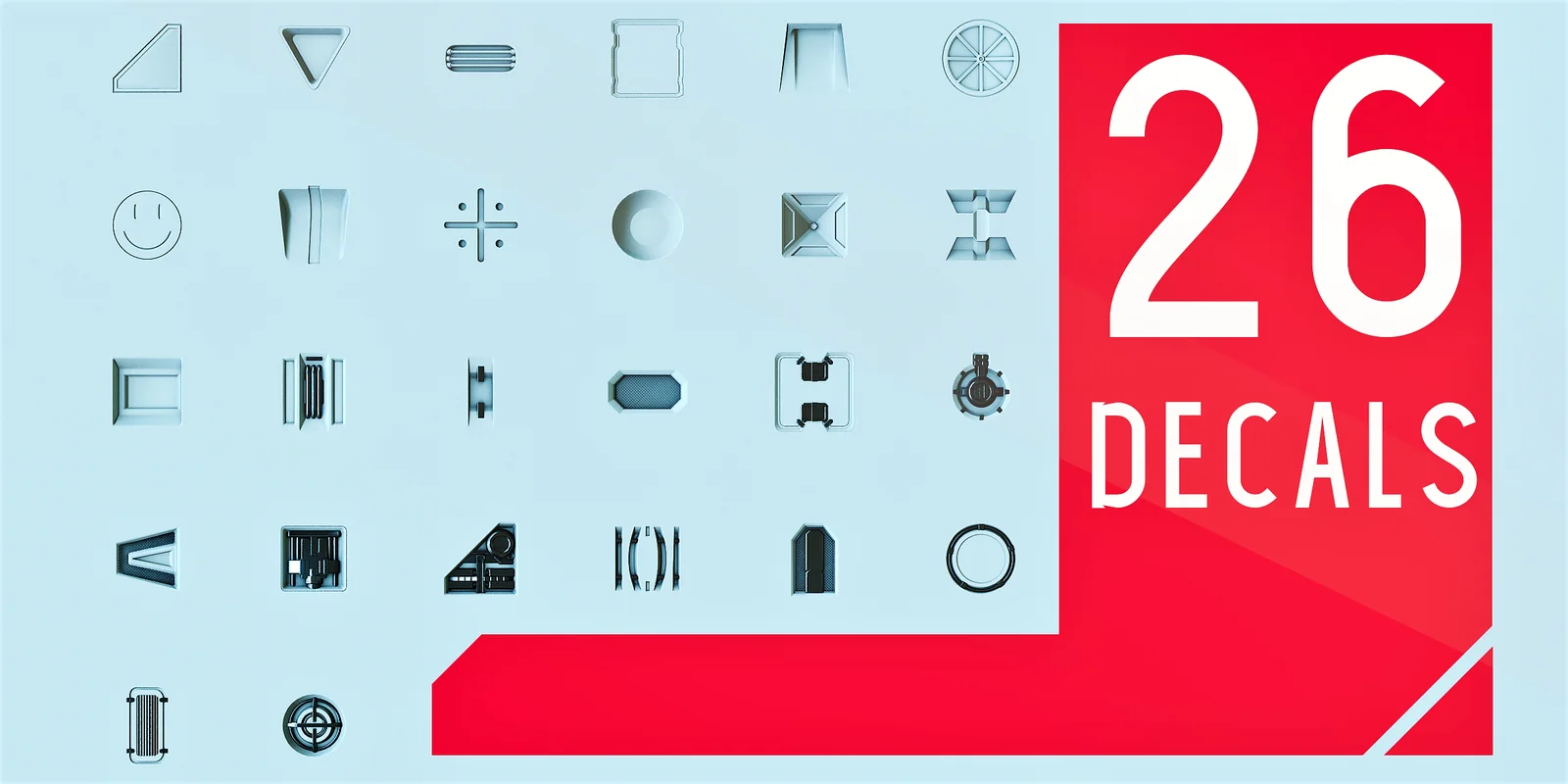 A collection of 26 decal textures designed for adding structural detail to hard surface models without increasing polygon count. Each decal in the set includes a normal map and an ambient occlusion (AO) map. The pack also contains a supplementary HDRI environment.
