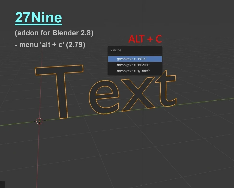 27Nine is an add-on that enables the conversion of mesh or text objects into curves. It supports Nurbs, Bezier, and Poly curve types. The tool can be accessed directly from the right-mouse-button context menu or by using the Alt+C keyboard shortcut.