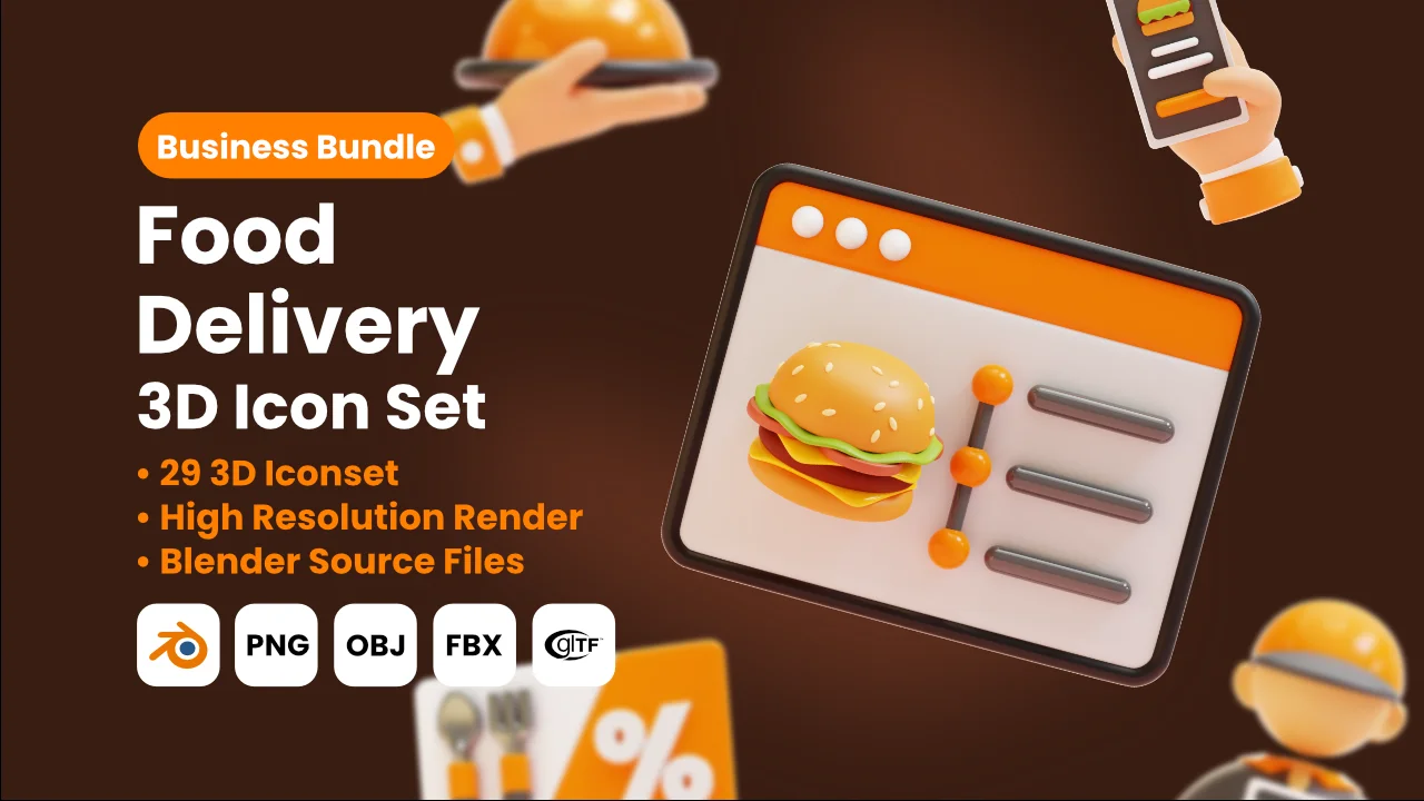 This collection provides 29 3D models themed around food delivery services. The items are supplied as native Blender files, keeping them accessible for modifications, lighting adjustments, or specific rendering setups. Additionally, the package includes pre-rendered PNG images at a high resolution of 3000 by 3000 pixels, making them immediately usable for graphic design or user interface applications.