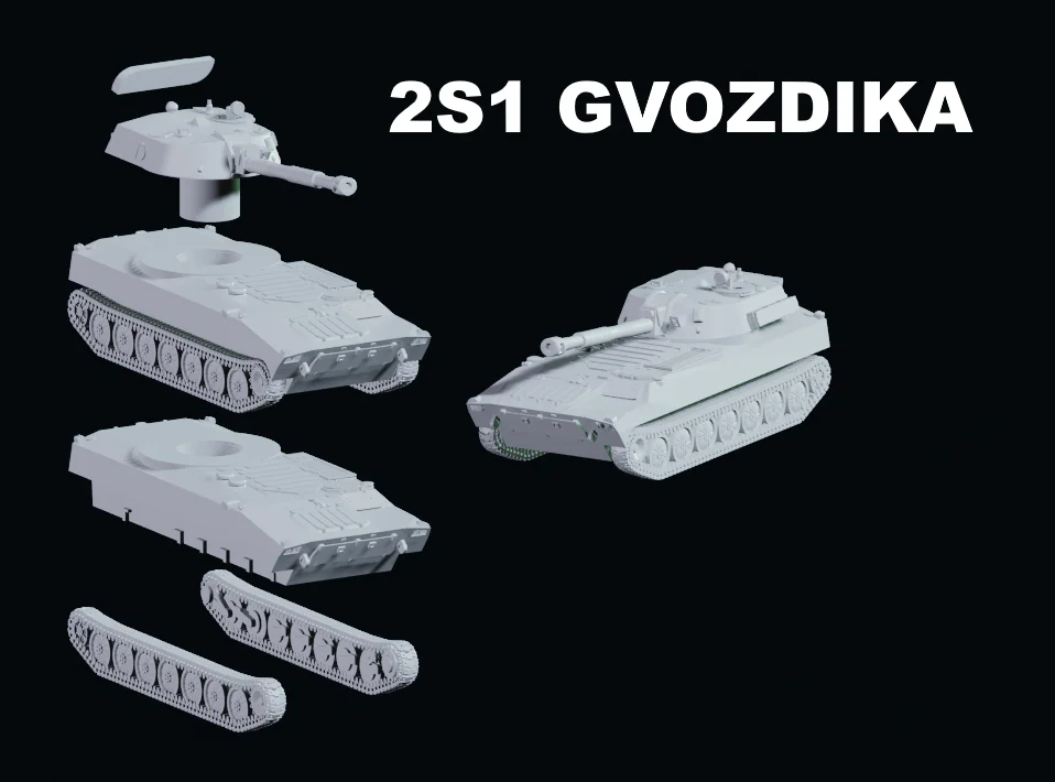 A 3D printable model of the 2S1 Gvozdika self-propelled howitzer. The model is natively scaled to 1/100, which aligns with standard 15mm wargaming miniature proportions. The package includes both unsupported formats suitable for FDM printing or custom support generation, as well as presupported files ready for resin printing. It also features an upgraded variant. While the model can be scaled larger, reducing the size below fifty percent is not recommended to maintain the structural integrity of thin parts.