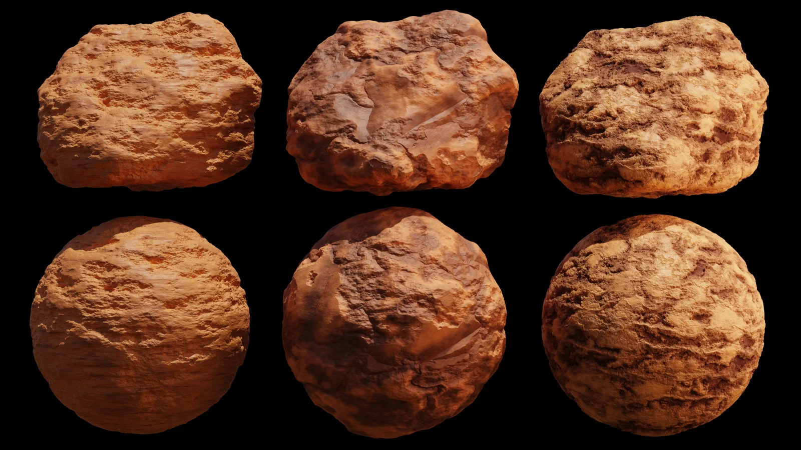 This pack includes three procedural desert rock materials built entirely within Blender's shader nodes. Each material is packaged as a custom node group, providing accessible parameters to adjust aspects like scale, roughness, bump, color, detail, noise, and distortion. Because the materials rely on displacement to generate their structure, they are specifically intended for use with the Cycles rendering engine. The package includes a Blender file containing the materials alongside an HDRI lighting setup for immediate rendering.