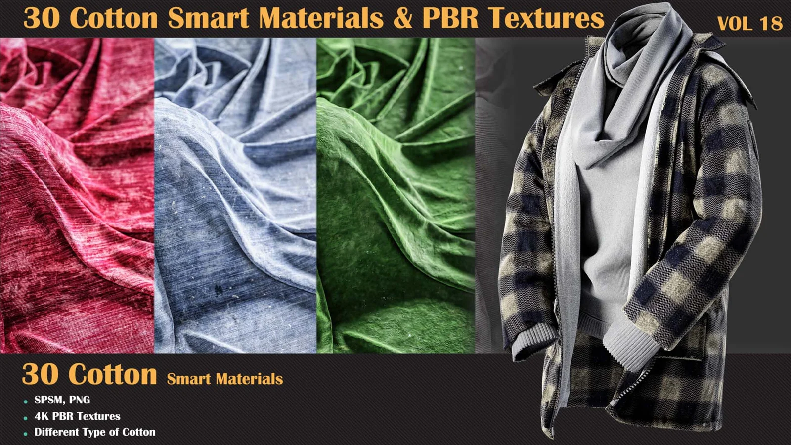This collection provides 30 procedural cotton materials. The product includes standard 4K PBR texture sets suitable for use in Blender or any other 3D software that supports standard physically based rendering workflows. The package also includes Substance Painter Smart Materials (SPSM), which require Substance Painter to utilize.