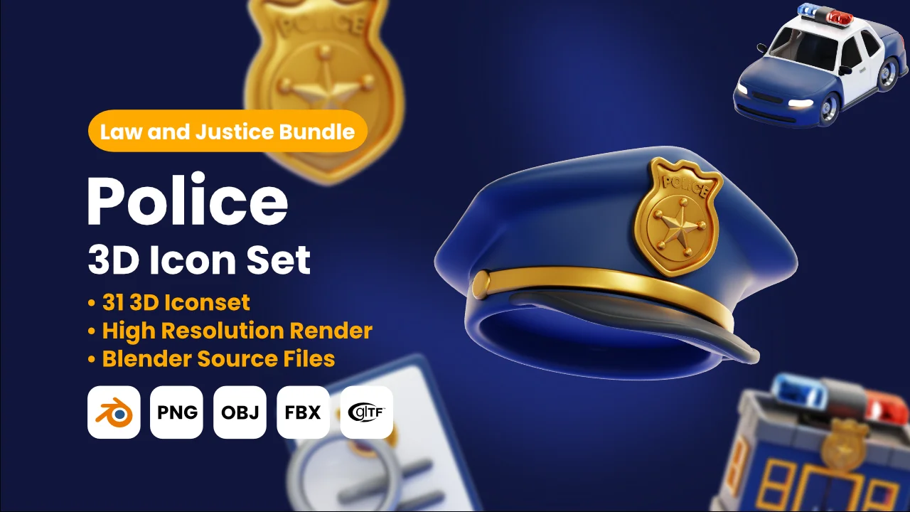 This asset pack contains a collection of 31 police-themed 3D icons. The models are provided as native Blender files, allowing for customization of materials, lighting, and composition within the software. Additionally, pre-rendered PNG files are included at 3000x3000 pixel resolution for immediate use in graphic design, UI layouts, or presentation projects.