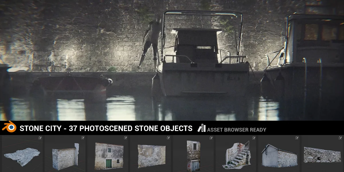 This collection provides 37 photoscanned models of stone architecture and environment props, including walls, houses, churches, and floors. The assets are constructed with low-poly geometry to maintain scene performance and are intended for mid-ground to background placement rather than extreme close-ups.
