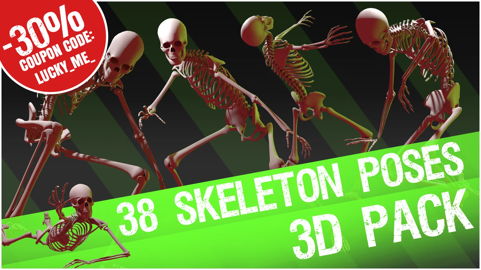 This pack provides a 3D human skeleton model arranged into 38 distinct poses. Delivered in the standard OBJ format, each skeleton features fully unwrapped UVs and consists of 14,679 polygons. The mesh geometry is organized to support two separate material assignments specifically designed for the bones and teeth.
