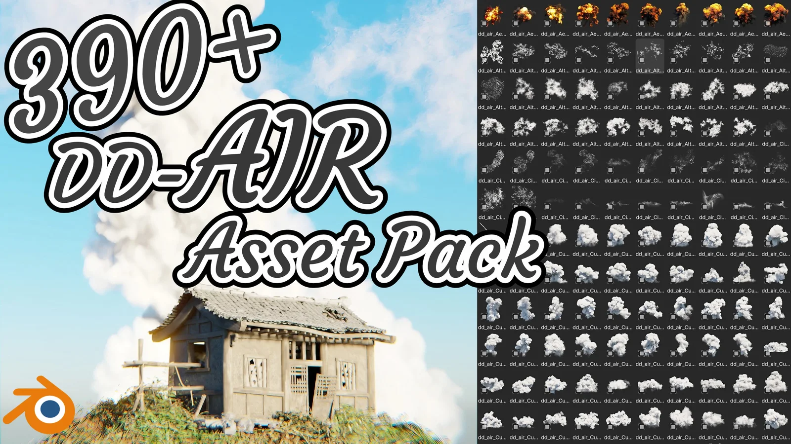This asset pack provides a collection of over 390 volumetric files for rendering atmospheric and combustion effects. The assets are supplied in both VDB format and as native Blender files. The collection is organized into specific categories, including clouds, tornadoes, explosions, smoke, and fire, alongside burning tree variations.