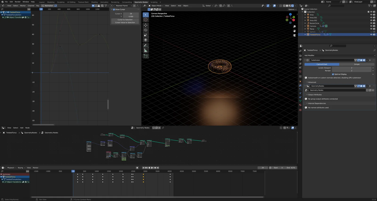 This product features an extruded torus built with Geometry Nodes and proximity nodes, designed to visualize imported audio tracks and frequencies. The provided file comes render-ready, including pre-configured lighting, materials, a backdrop, and animations.