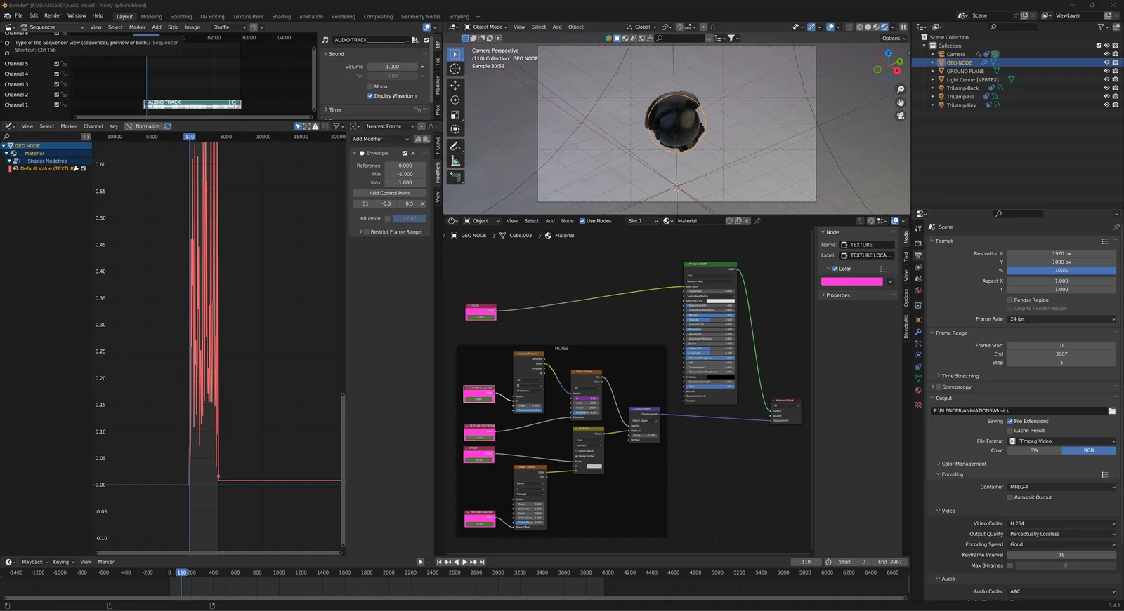 This product provides a prepared Blender setup for generating 3D audio visualizations. Featuring a custom material shader node tree applied to a sphere, the setup reacts to imported audio tracks or specific frequencies to create dynamic visual patterns. The included scene comes fully configured with lighting, materials, and animation settings, providing an optimized workspace for importing audio and rendering out customized video files.