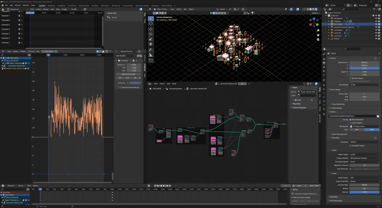This Blender file provides a geometry nodes tree designed for creating audio visualization animations. The setup is built to process custom audio inputs and generate animated geometric patterns, specifically featuring ring and cube structures. It serves as a tool for generating music visualizers and sound-reactive 3D elements.