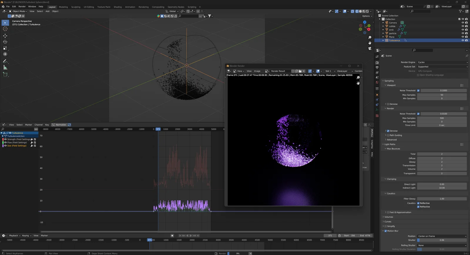 This Blender file provides a pre-configured audio visualization environment. It centers on a turbulent sphere effect that responds to audio frequencies. The setup integrates particle emission and collision simulations tied to imported sound via the graph editor's f-curve baking tools.