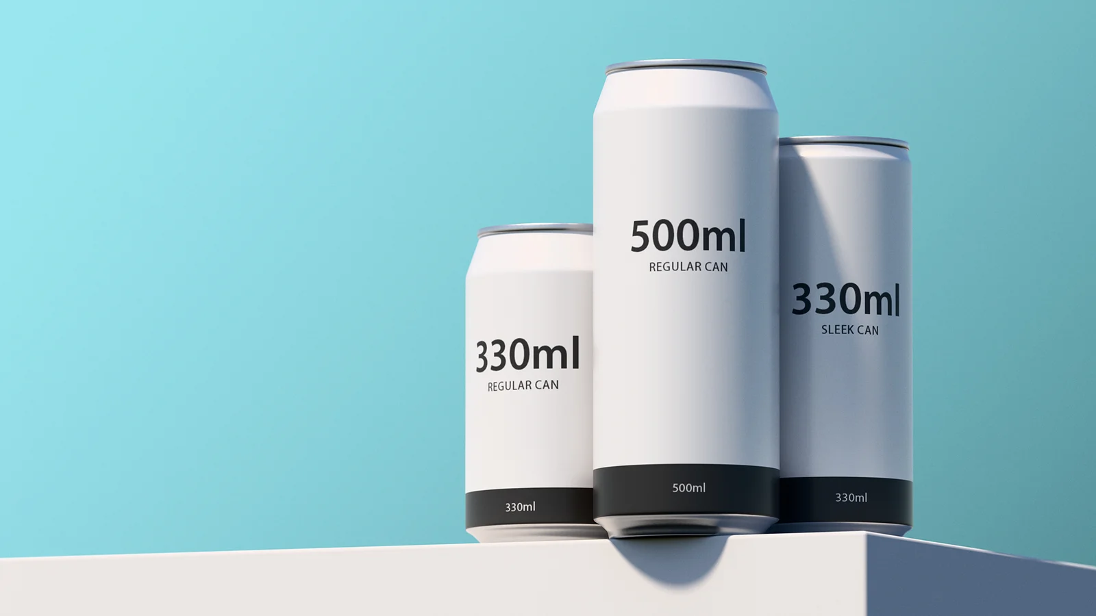 This asset includes three detailed beverage can models: a 330ml regular can, a 330ml sleek can, and a 500ml regular can. Each model is built to resemble real-world packaging and features separate metal materials for the top and bottom surfaces, alongside an artwork material for applying custom label designs. The file also provides a studio packshot scene equipped with lighting and two camera angles, as well as a simple environment setup for showcasing the designs.