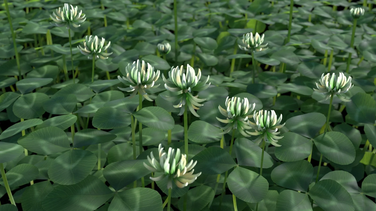 A set of 3D botanical models featuring 10 distinct clover variations and 8 different flower types. The models are provided in .blend, .fbx, and .obj formats. The Blender files include pre-configured materials ready for rendering in the Cycles engine, supported by a set of included .jpg texture maps.