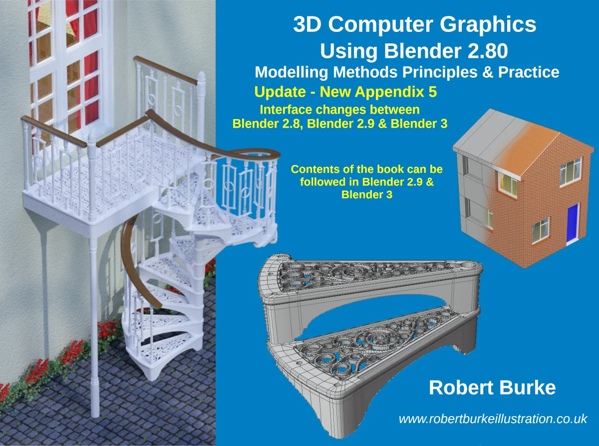 This 522-page PDF book provides a comprehensive guide to 3D modeling in Blender. It is designed for new and intermediate users, offering both reference material for Blender's modeling tools and practical, step-by-step exercises. The core projects include building a basic low-poly house and a detailed spiral staircase, which are used to demonstrate techniques throughout the text.