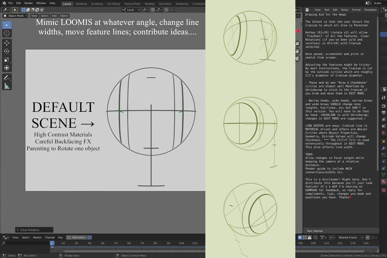 A 3D framework designed to assist artists with sketching human heads. Based loosely on the Andrew Loomis method, this Blender setup uses a collection of curve objects parented to a central controller to easily pose the head using trackball rotation. The file includes internal guides for marking the corners of the brows and cheekbones. It features automated camera focal length adjustments tied to positioning, simulating various lens distortions like telephoto and fisheye while keeping the guide framed within the render border.