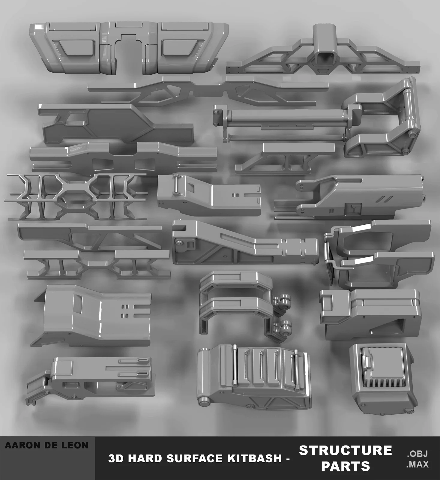 This kitbash library contains 20 structural and bracer meshes designed for hard surface and mech modeling. The models are subdivision-ready and were created without UV maps. Each asset is provided as an individual OBJ file exported at the center origin without applied smoothing, allowing for clean importation and custom subdivision workflows in your preferred 3D software.