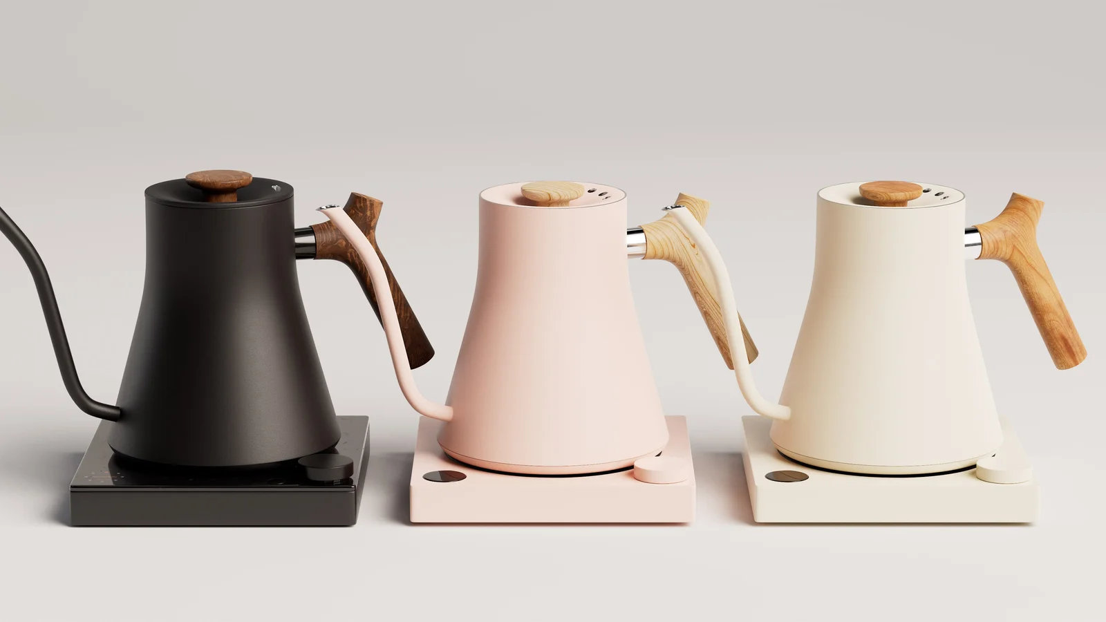 A 3D model of the Stagg EKG kettle, featuring both the Regular and Studio Pro base styles. The geometry is configured to be subdivision-ready for high-resolution rendering. The asset includes seven color variations and three wood types.