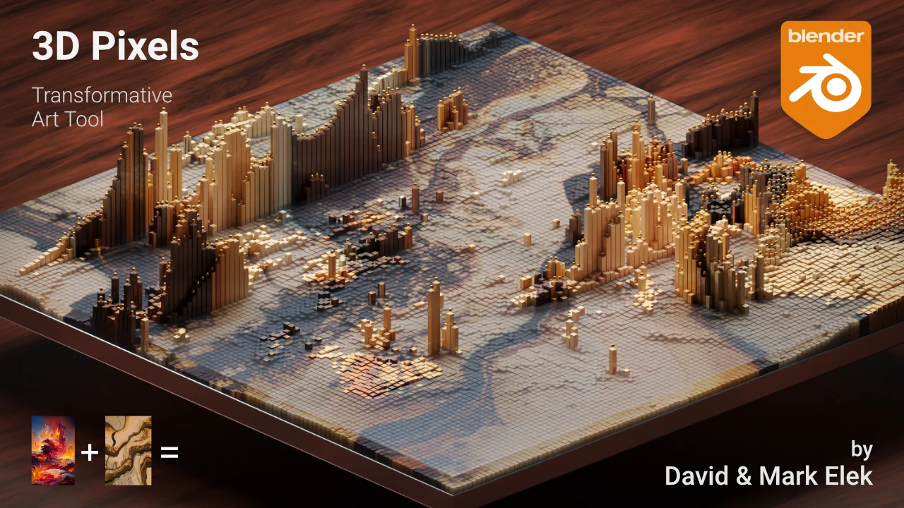 This Geometry Nodes setup allows users to create 3D pixel or pin art style renders by combining two 2D images. The system uses one image as a color map and a second image as a height map to drive the instancing of a selected 3D object. The project includes a customized sidebar panel, powered by an embedded Python script, to streamline the adjustment of settings. It is designed specifically for the Cycles render engine and includes a selection of simple starter materials.