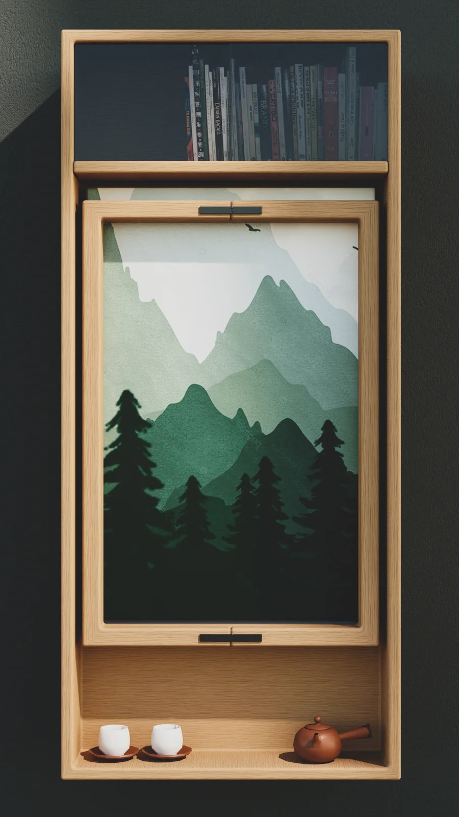 This product is a 3D model of a space-saving wall-mounted folding table and chair set. The design features a desk that folds flush against the wall when not in use, along with a matching chair that stores within a dedicated rear compartment.