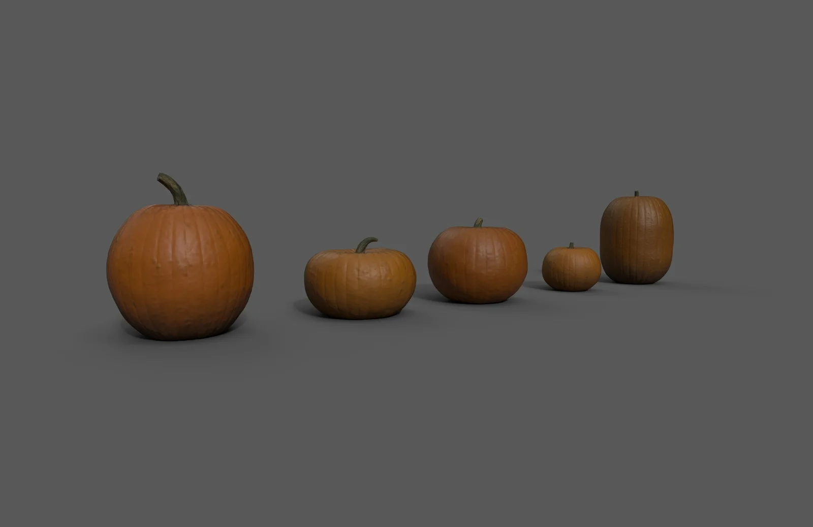 A collection of five realistic 3D pumpkin models meant for Halloween, Thanksgiving, or autumn-themed scenes. The models are provided in both .blend and FBX formats, featuring triangulated topology with a combined total polygon count of approximately 26,000 faces across all five assets.