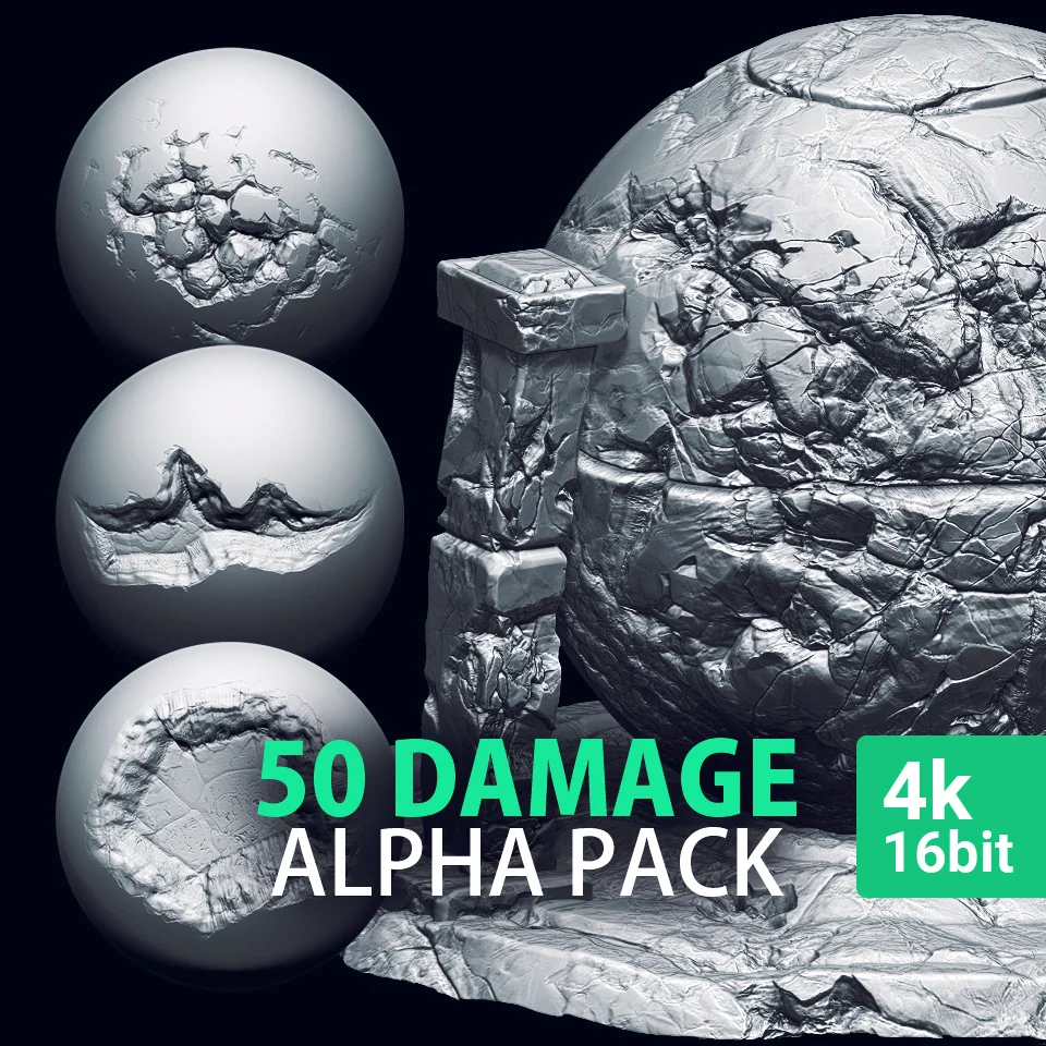 A collection of high-resolution alpha textures designed for detailing 3D models with structural damage. The pack includes 16-bit, 4K resolution PSD files that can be used as brush stamps or displacement masks.