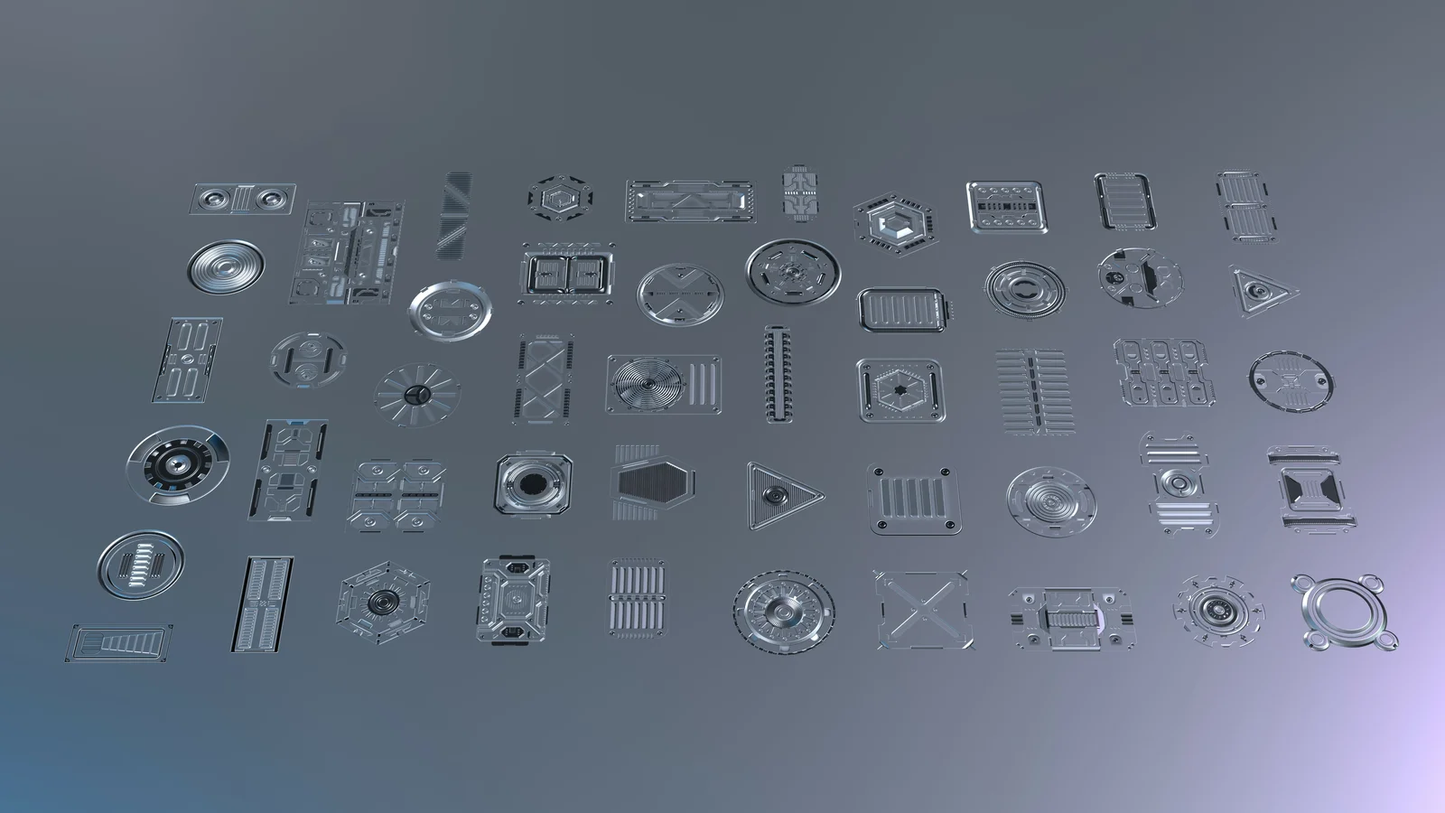 A collection of 50 hard surface decals designed for adding mechanical detailing to 3D models. The decals are baked at 1024x1024 resolution and are pre-configured for direct use with the DecalMachine add-on in Blender. They can also be used as standard texture decals in other 3D software or game engines.