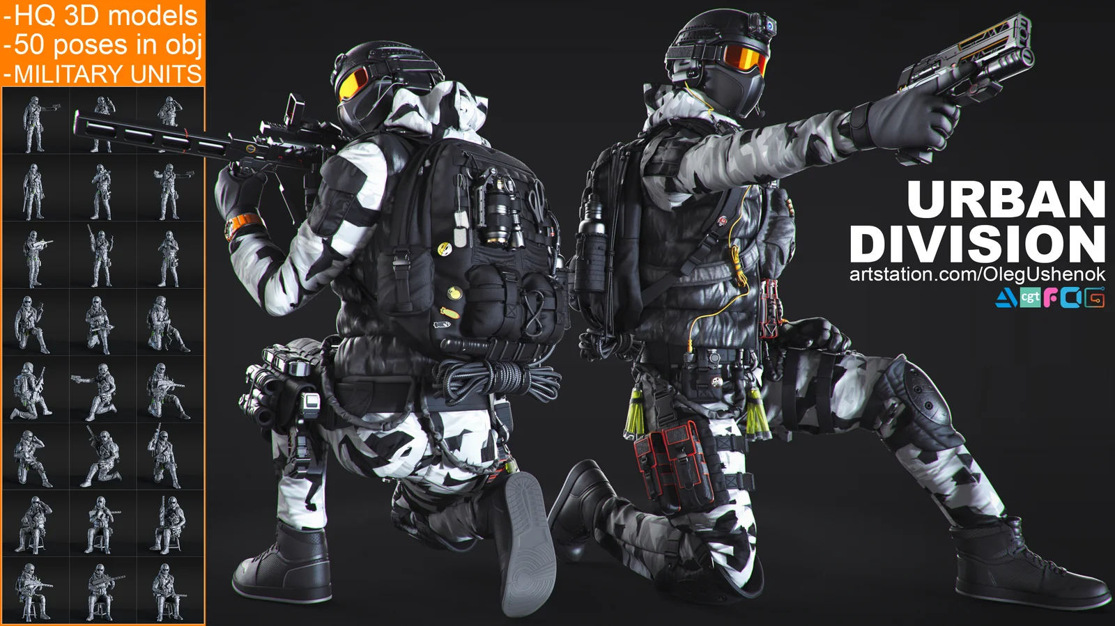 This asset pack contains 50 high-resolution 3D models of soldiers in various static poses. The characters feature a hybrid design that combines elements of street clothing with tactical military gear. Each model is highly detailed, containing approximately 12 million polygons, and is provided in the universally compatible OBJ format.