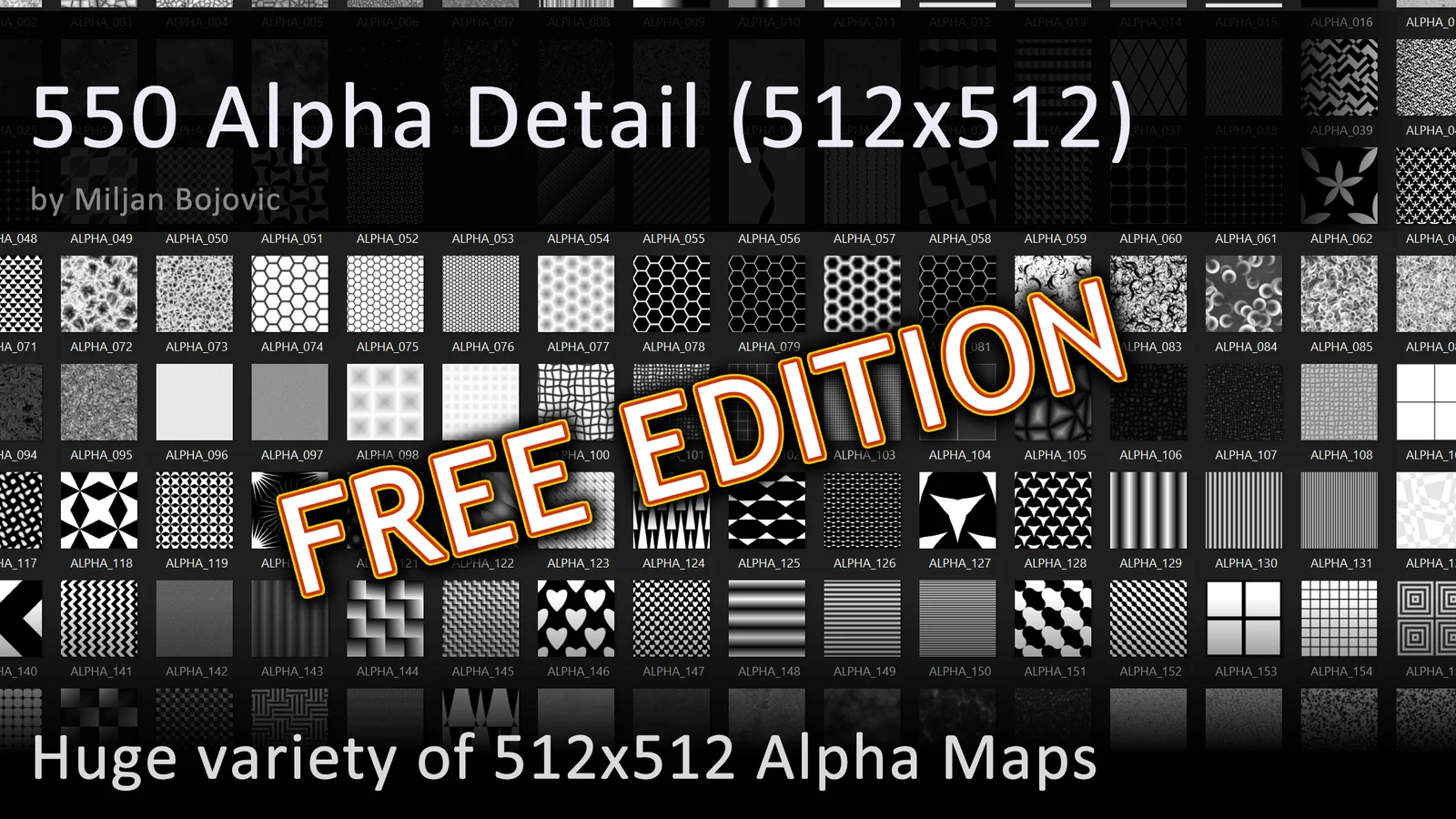 This is a free sample pack containing a selection of alpha and detail texture maps provided at a 512x512 resolution. The collection features a variety of surface details including geometric shapes, Perlin noise variations, plaster finishes, concrete surfaces, and miscellaneous patterns. These maps can be used to add surface details to 3D materials or as alphas for sculpting workflows.