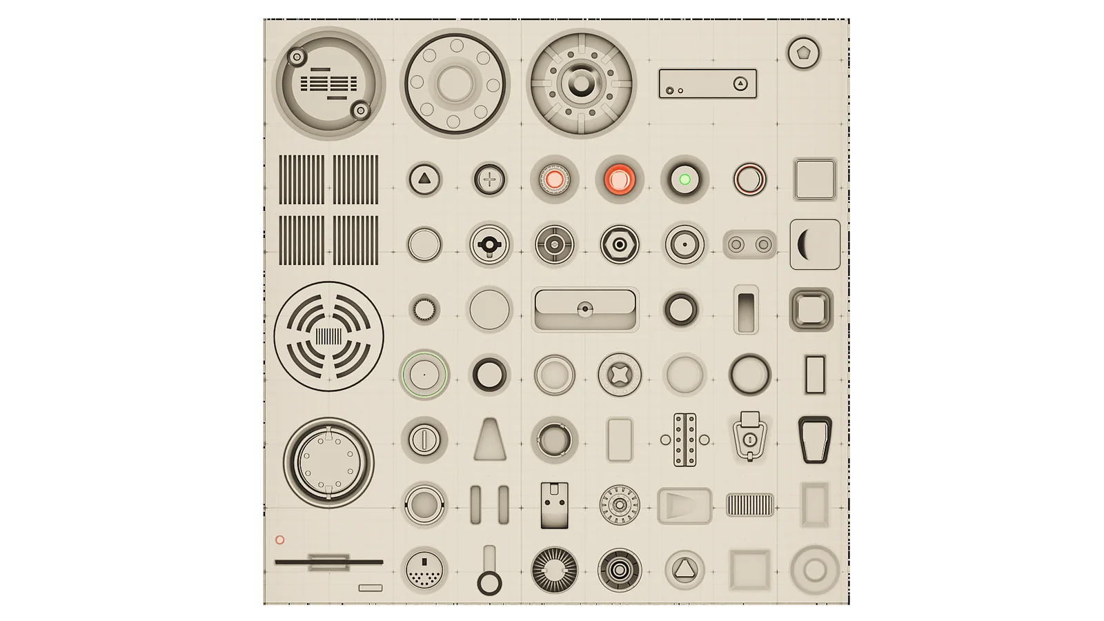 This collection provides 58 decals designed for detailing hard-surface models, including specific emission elements. The assets are pre-configured to be immediately compatible with the Decal Machine add-on. Additionally, the pack includes seven 2K texture atlases.