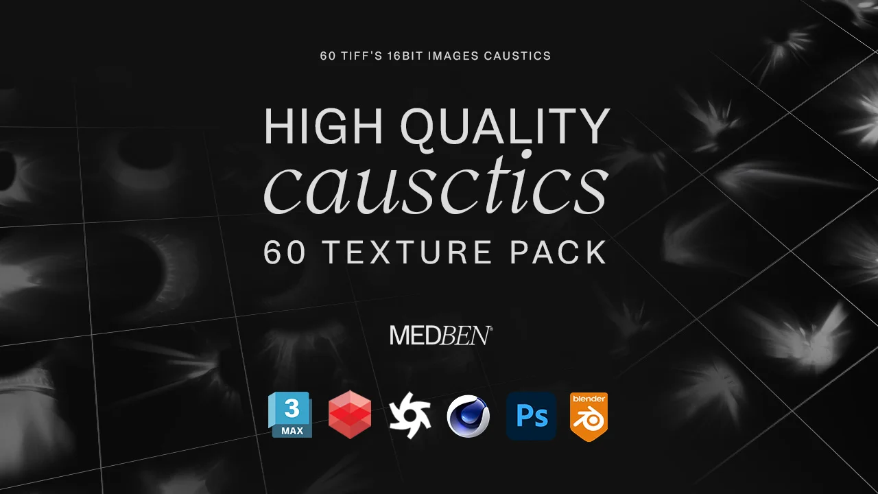 A collection of 60 high-resolution caustic textures designed for rendering and post-production workflows. Derived from real photographs, these textures feature transparent backgrounds for easy integration when working with glass, bottles, diamonds, and other refractive materials. The pack includes 16-bit TIFF images provided in 4K resolution for smaller details and 6K resolution for larger light patterns, compatible with rendering engines like Cycles and image editing applications.