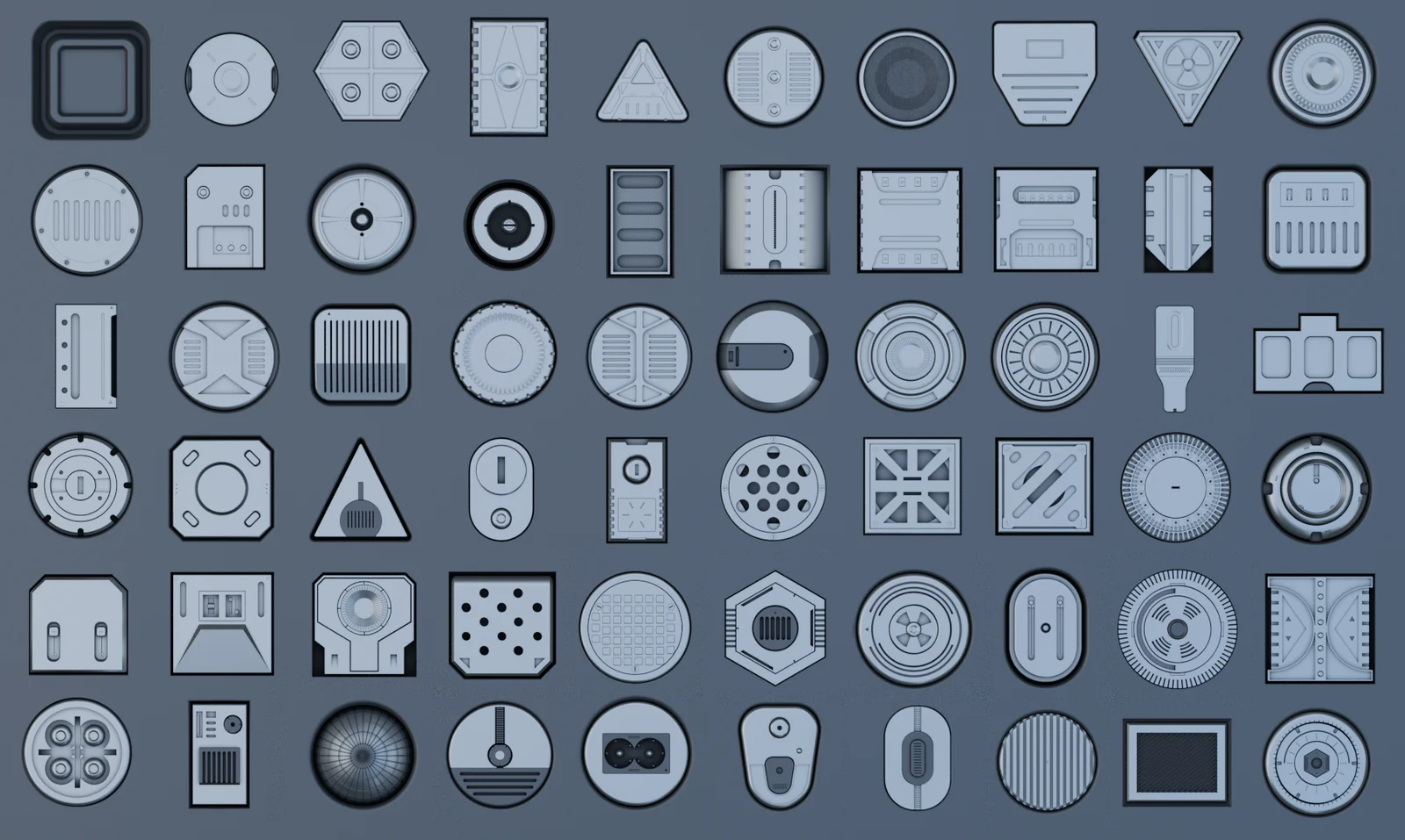 This texture pack provides 60 specialized decals designed to add intricate sci-fi details like paneling, markings, and vents to hard surface models. The assets are formatted exclusively for use with the Decal Machine add-on, integrating directly into its non-destructive detailing workflow. When applied, users can adjust both the parallax effect and the apparent height of the decals to suit environments, futuristic vehicles, and mechanical props.