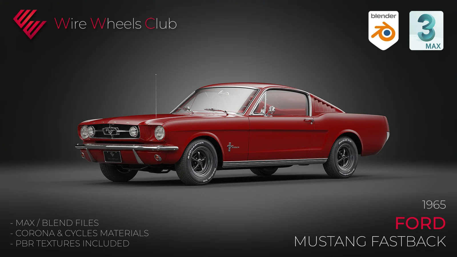 This product provides a high poly 3D model of a 1965 Ford Mustang Fastback containing 2.5 million triangles. The package includes a Blender 4.2 scene fully configured with materials and an environment for both the Cycles and EEVEE render engines, alongside compositor and post-processing setups. It also provides the model in FBX and OBJ formats, a complete PBR texture set utilizing a metallic/roughness workflow, and a 3ds Max 2015 scene with Corona 7 materials. The model uses centimeter units.