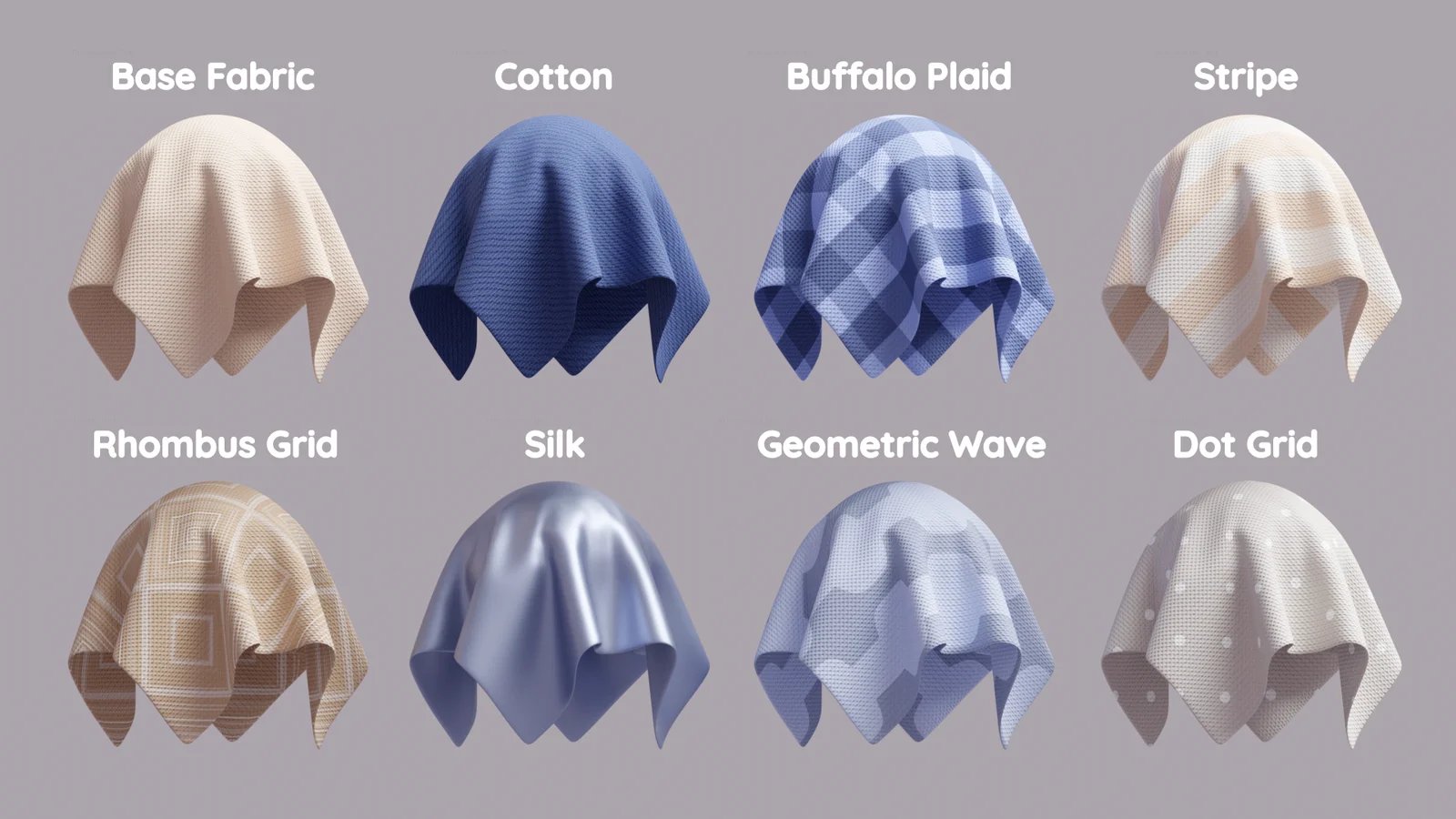 This asset pack contains eight procedural fabric materials built for Blender's shader editor. Each material is structured as a dedicated node group with adjustable settings to control the final pattern and appearance. The collection includes a base fabric alongside specific patterns like cotton, buffalo plaid, stripe, rhombus grid, silk, geometric wave, and dot grid. These materials are optimized for the Cycles rendering engine and are also fully compatible with EEVEE.