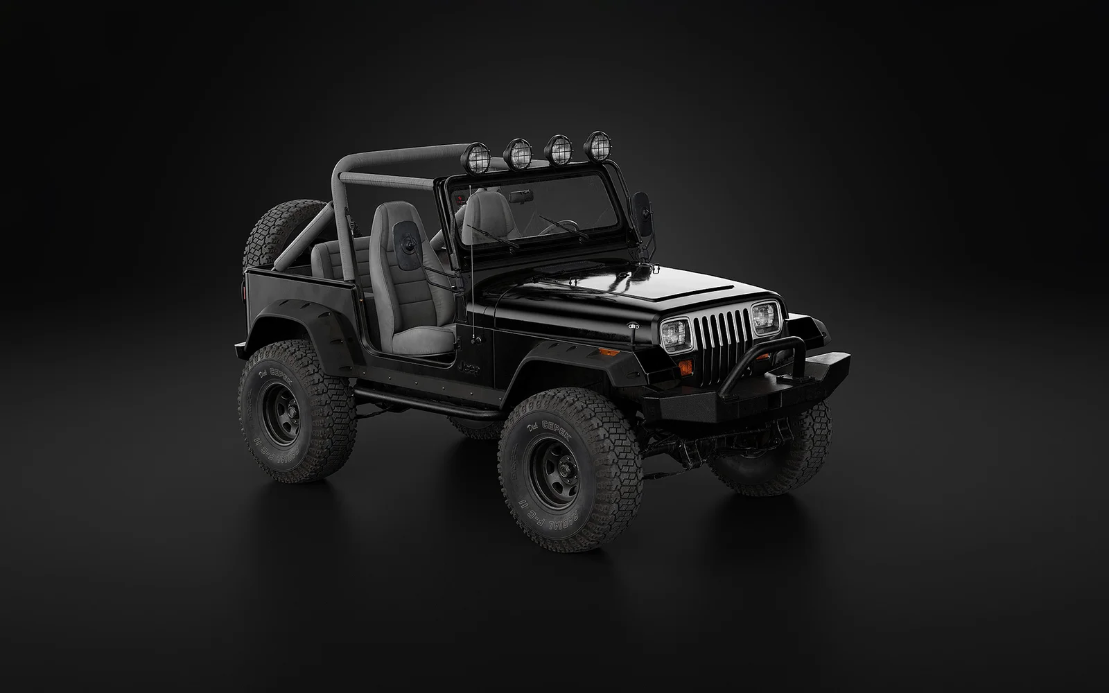 This is a detailed 3D model of a customized 1987 Jeep Wrangler. The high-poly model features an accurate and detailed exterior and interior. The package includes a Blender 3.3 scene configured with materials and an environment suitable for both Cycles and EEVEE render engines.